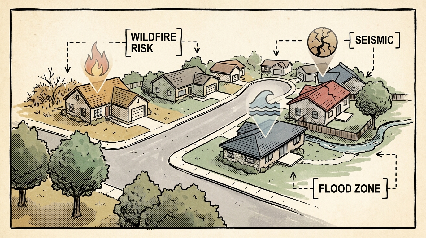 Drop a pin or enter your address to see wildfire, flood, earthquake, hurricane, and nuclear risk scores for any location in the contiguous US.